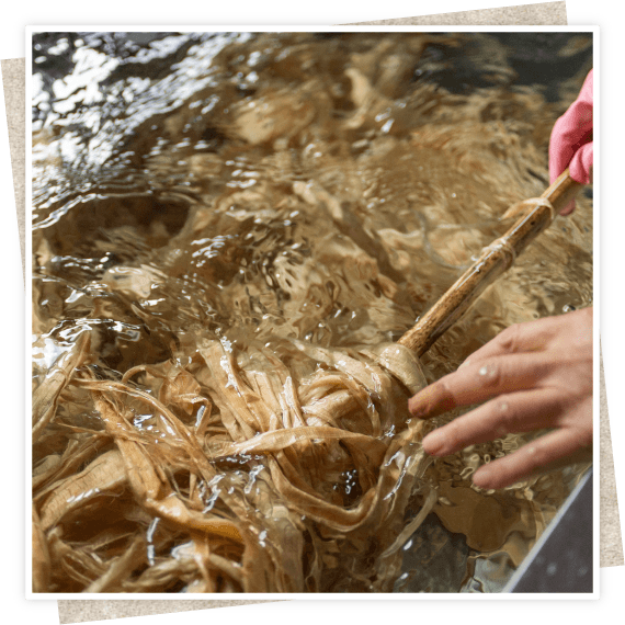 It seems more efficient and quicker to use caustic soda in the process but it will also dissolve and drain the lye(aku) of the plant. To obtain a good quality, to take advantage of the goodness of the Japanese paper it is needed to leave the lye. As a commitment, the process used instead(boiling with soda ash – sodium carbonate) will be longer, will take time and effort. Also, the craftsman will not use adhesive for gathering the paper but instead will use a process hydrogen bonds in which long fibers intricately intertwine.